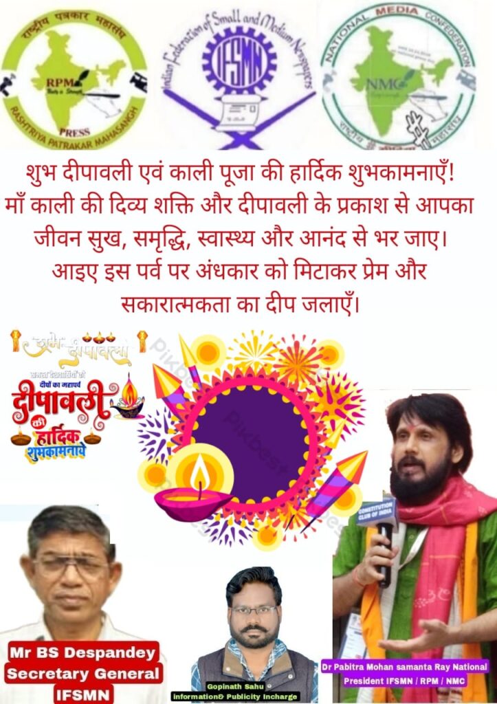 राष्ट्रीय पत्रकार महासंघ (RPM), इंडियन फेडरेशन ऑफ स्मॉल एंड मीडियम न्यूज़पेपर्स, तथा नेशनल मीडिया कॉन्फेडरेशन के राष्ट्रीय अध्यक्ष डॉ. पबित्र मोहन समंतराय ने दीपावली एवं कालीपूजा के पावन अवसर पर सभी सदस्यों, राज्य, राष्ट्रीय एवं जिला पदाधिकारियों सहित सभी राज्यों और केंद्रशासित प्रदेशों के नागरिकों तथा समस्त देशवासियों को हार्दिक शुभकामनाएँ दी हैं।