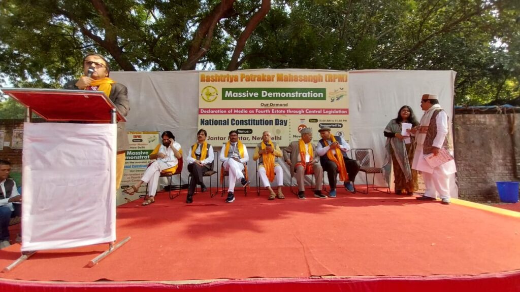 ନୂଆଦିଲ୍ଲୀ, ଜନ୍ତର–ମନ୍ତର: ସଂବିଧାନ ଦିବସ ଅବସରରେ ରାଷ୍ଟ୍ରୀୟ ପତ୍ରକାର ମହାସଂଘ (RPM) ଦ୍ୱାରା ଜନ୍ତର–ମନ୍ତରରେ ବିଶାଳ ଧରଣା, ପ୍ରତିବାଦ ସଭା ଓ ଜନଜାଗରଣ କାର୍ଯ୍ୟକ୍ରମ ଆୟୋଜିତ ହୋଇଥିଲା। ସଭାରେ କେନ୍ଦ୍ର ସରକାରଙ୍କୁ ଦାବି କରାଗଲା ଯେ ବିଶେଷ କେନ୍ଦ୍ରୀୟ ଆଇନ ମାଧ୍ୟମରେ ମାଧ୍ୟମକୁ ସଂବିଧାନିକ ଭାବେ ଲୋକତନ୍ତ୍ରର ଚତୁର୍ଥ ସ୍ଥମ୍ଭ ଘୋଷଣା କରାଯାଉ। ଏହି ସମ୍ବନ୍ଧରେ ରାଷ୍ଟ୍ରପତି ଓ ପ୍ରଧାନମନ୍ତ୍ରୀଙ୍କୁ ମଧ୍ୟ ଜ୍ଞାପନ ପ୍ରଦାନ କରାଗଲା।