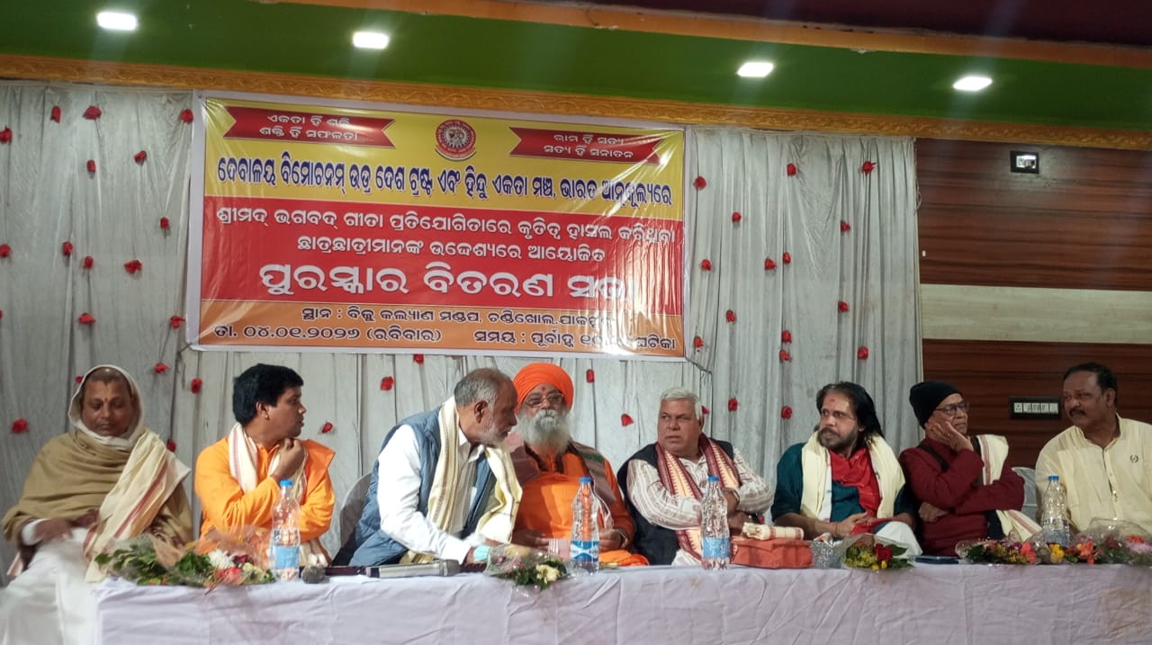 ଚଣ୍ଡିଖୋଲ ସ୍ଥିତ ବିଜୁ କଲ୍ୟାଣ ମଣ୍ଡପ ସଭା ଗୃହରେ ହିନ୍ଦୁ ଏକତା ମଞ୍ଚ ଭାରତ ଓ ଦେବାଳୟ ବିମୋଚାନାମ ଉଡ୍ର ଦେଶ ଟ୍ରଷ୍ଟ ର ମିଳିତ ଆନୁକୂଲ୍ୟରେ ଏକ ପୁରସ୍କାର ବିତରଣ ସଭା ସଂଗଠନ ର ସଭାପତି ପ୍ରଦୀପ୍ତ କୁମାର ଜେନା ଙ୍କ ସଭାପତିତ୍ୱ ରେ ଅନୁଷ୍ଠିତ ହୋଇଥିଲା। ଉକ୍ତ ସମ୍ବର୍ଦ୍ଧନା ସଭାରେ ପରମହଂସ ଶ୍ରୀମଦ ସ୍ୱାମୀ ବ୍ରହ୍ମାନନ୍ଦ ସରସ୍ବତୀ ମହାରାଜ ମୁଖ୍ୟ ଅତିଥି, ଡକ୍ଟର ହରିହର କାନୁନଗୋଜଗନ୍ନାଥ ସଂସ୍କୃତି ବିଶେଷଜ୍ଞ, ପ୍ରାକ୍ତନ ନିର୍ଦ୍ଧେଶକ ଓଡ଼ିଆ ଭାଷା ପ୍ରତିଷ୍ଠାନ, କୁଳପତି ବେଦ ବିଶ୍ୱ ବିଦ୍ୟାଳୟ ତିରୁ ବନ୍ନାମଲାଈ ମୁଖ୍ୟ ବକ୍ତା ଡକ୍ଟର ପବିତ୍ର ସାମନ୍ତରାୟ,ମୁଖ୍ୟ ସମ୍ପାଦକ ପର୍ଯ୍ୟବେକ୍ଷକ ଓ ଦି କଳିଙ୍ଗ କ୍ରୋନିକେଲ ସମ୍ମାନନୀୟ ଅତିଥି ଡକ୍ଟର ନିରଞ୍ଜନ ସାହୁ ସମ୍ମାନନନୀୟ ଅତିଥି , ବାବା ବିଶ୍ୱନାଥ ଦାସ ସିଧ୍ୟ ଗିରି ଆଶ୍ରମ ର ମହନ୍ତ,ସମ୍ମାନନୀୟ ଅତିଥି ଏବଂ ଯାଜପୁର ଜିଲ୍ଲା ହିନ୍ଦୁ ଏକତା ମଞ୍ଚ ର ସଭାପତି ନରେନ ଜେନା ପ୍ରଭୃତି ଯୋଗ ଦେଇ ଭଗବତ ଗୀତା ର ଉପଯୋଗୀତା ଓ ଏହା କିପରି ପ୍ରତ୍ୟେକ ବ୍ୟକ୍ତି ର ଜୀବନକୁ ଶୃଙ୍ଖଳିତ କରିବା ସହିତ ଉଚିତ ମାର୍ଗରେ ପରିଚାଳନା କରିବାରେ ସହାୟକ ହୁଏ ତାର ବିଷଦ ଭାବରେ ଆଲୋଚନା କରି ଛାତ୍ର ଛାତ୍ରୀ ମାନେ ପ୍ରତ୍ୟେକ ଦିନ ଗୀତା ପଢିବା କୁ ପ୍ରେରଣା ଦେଇଥିଲେ। ହିନ୍ଦୁ ଏକତା ମଞ୍ଚ ସଂଗଠନ ଆନୁକୂଲ୍ୟରେ ଯାଜପୁର ଜିଲ୍ଲା ରେ ଅନୁଷ୍ଠିତ ହୋଇଥିବା ୪୪ ଟି ବିଦ୍ୟାଳୟ ର କୃତି ଛାତ୍ର ଛାତ୍ରୀ ମାନଙ୍କୁ ଗୀତା ବହି ଟ୍ରଫି ସାର୍ଟିଫିକେଟ ଆଦି ପ୍ରଦାନ କରିଥିଲେ ଭିଭିନ୍ନ ବିଦ୍ୟାଳୟ ରେ ଗୀତା ପରୀକ୍ଷା ରେ ସହଯୋଗ କରିଥିବା ସଂଯୋଜକ ଯଥା କୁଞ୍ଜ ବିହାରୀ ରାୟ, ଘନଶ୍ୟାମ ବିଶ୍ୱାଳ, ଅନନ୍ତ ନାରାୟଣ ମିଶ୍ର କୁଳମଣି ମଲ୍ଲିକ, ଗିରିଧାରୀ ସାମଲ ବନମାଳୀ ରଥ ପୁରୁଷୋତ୍ତମ ନାୟକ ଅକ୍ଷୟ କୁମାର ପଟୁ ପ୍ରଭୃତି ଙ୍କୁ ସମ୍ବର୍ଦ୍ଧିତ କରାଯାଇଥିଲା. ସୁଶୀଲ ପାଲ ତେଜ଼ପାଳ ଧେନୁକା ବ୍ରଜକିଶୋର ଜେନା ରାଜକୁମାର ଖେମେକା ଡକ୍ଟର ପଦ୍ମଲୋଚନ ନାୟକ ସଭାପତି କଟକ ଜିଲ୍ଲା ହିନ୍ଦୁ ଏକତା ମଞ୍ଚ ସଂଗଠନ ଉପସ୍ଥିତ ରହି ପୁରସ୍କାର ବିତରଣ କାର୍ଯ୍ୟ ରେ ସହଯୋଗ କରିଥିଲେ. ଅଧ୍ୟାପକ ନିରଞ୍ଜନ ସାମଲ ସଭା ଟିକୁ ପରିଚାଳନା କରିଥିଲେ ଓ ଧନ୍ୟବାଦ ଅର୍ପଣ କରିଥିଲେ